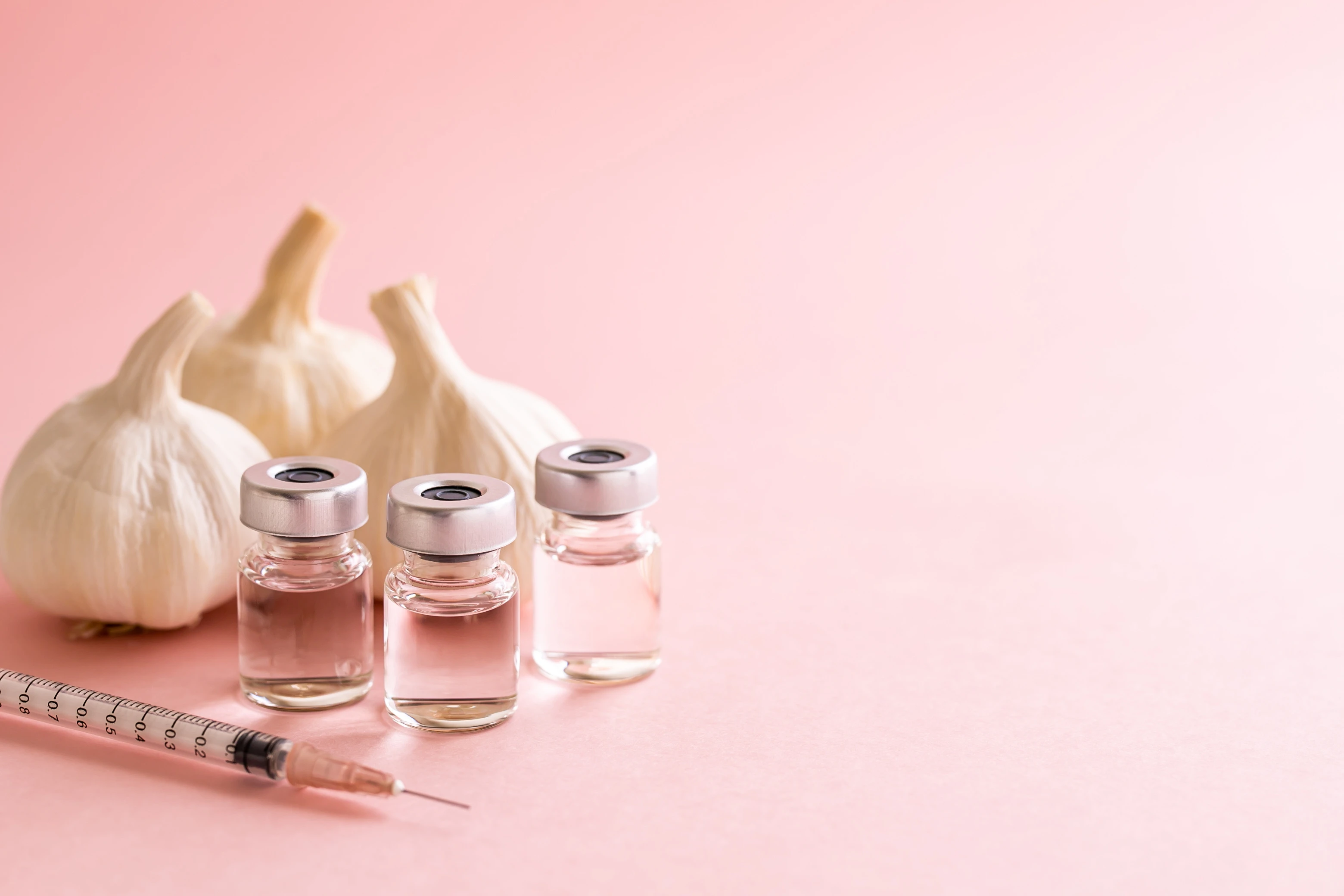 にんにく注射とは、にんにくと同じビタミンB1が主成分となった注射のことです。注射の際、ビタミンB1の含まれる硫黄がにんにくの臭がすることから「にんにく注射」と呼ばれています。もちろん、にんにくエキスは入っていません。